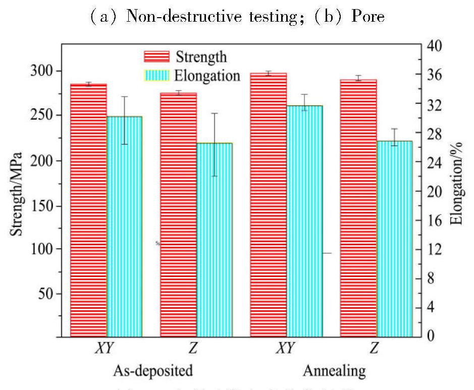 图7为成形试样室温拉伸性能。沉积态试样中,XY向取样试样平均抗拉强度为277 MPa,断后伸长率为30%,而Z向平均抗拉强度为267 MPa,断后伸长率为27%。无论XY向还是Z向,抗拉强度及断后伸长率均达到标准AWSA5.01/A5.10的性能要求。经均匀化退火后,试样的抗拉强度升高约5%;同时从断后伸长率变化可以看出,试样的塑性也有所提升。这是由于β(Al3 Mg2 )析出相有利于提高合金的耐蚀性,对合金起弥散强化作用