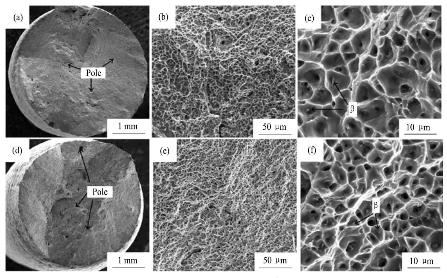 表明,在拉伸应力作用下,由于第二相粒子的存在,会导致显微空洞的形成,最终导致断裂,形成韧窝断口形貌,表现为典型的穿晶断裂模式。对比发现均匀化退火后的拉伸断口中,韧窝尺寸更为细小,且分布更为均匀,因此退火后试样的塑性较好。这主要是由于经均匀化退火后,β析出相分布更为弥散均匀。