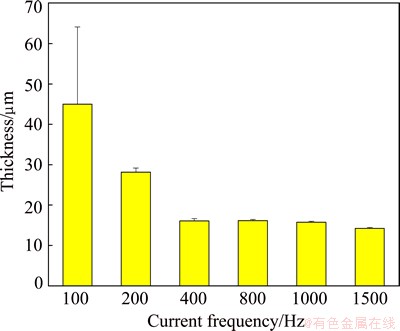 Fig. 3 Thickness of coatings produced at different current frequencies