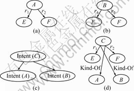 Before obtaining AO from ontology viewpoints, firstly pay attention to a group of special concepts. Here, they are named as cognate concepts, which can be defined as: if there exist a group of concepts in all ontology viewpoints, and each of these concepts in their ontology viewpoints and the relations and concepts are related to these cognate concepts, the group of concepts will be cognate ones. As to cognate concepts, if the intersection of their attribute sets is not empty, we expect to use a public concept to express semantic in AO. Meanwhile, the public concept and cognate concepts should maintain paternity [12]. As a result, we need to alter the ontological graph of ontology viewpoints. The altering process is shown in Fig.2, in which Intent(C)= Intent(A)∩ Intent(B).