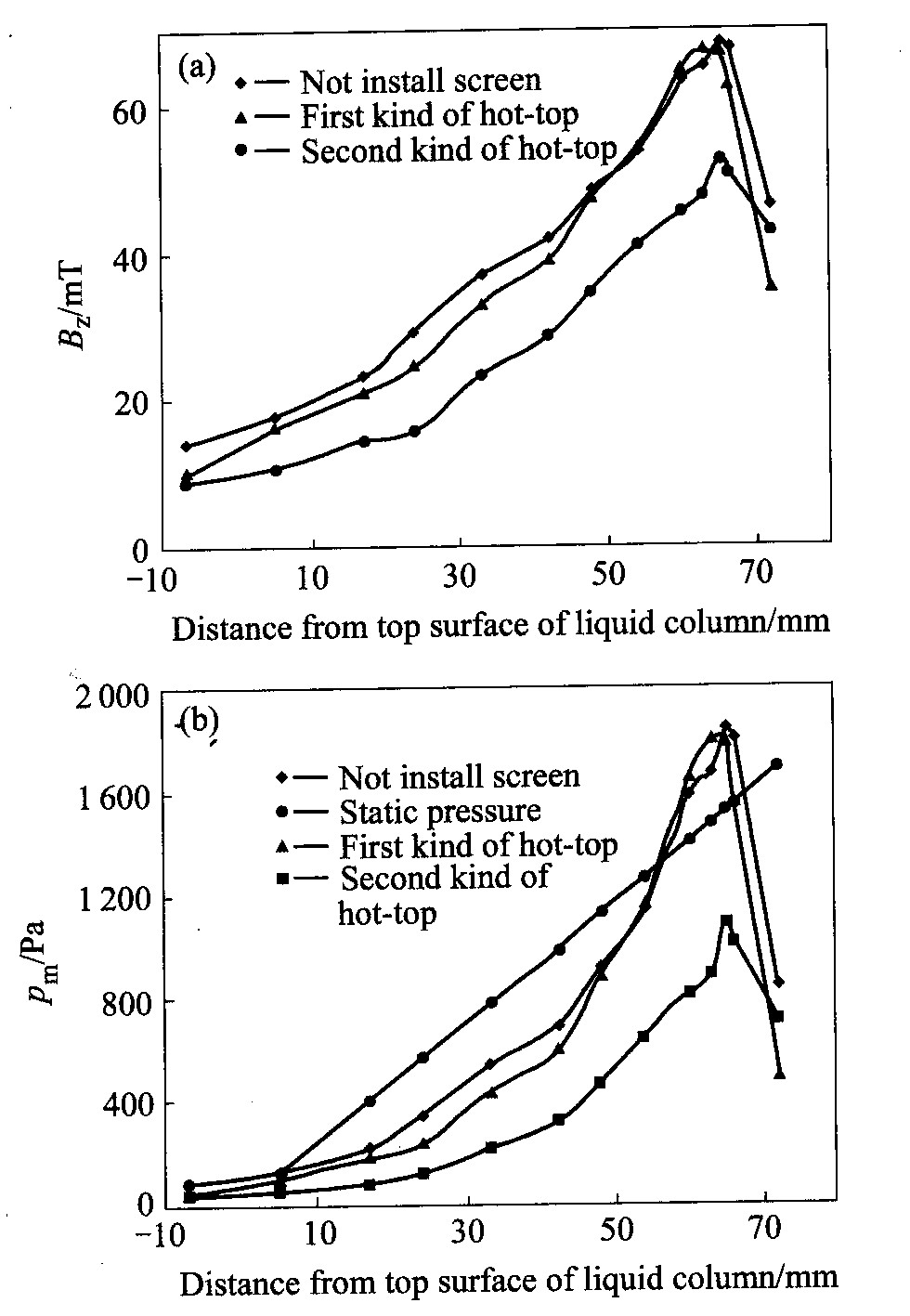 2) 施加对开式热顶, 磁场强度和电磁压力分布合理, 满足工艺要求。