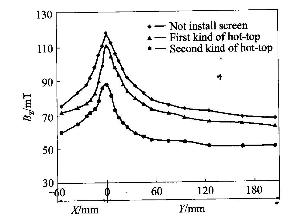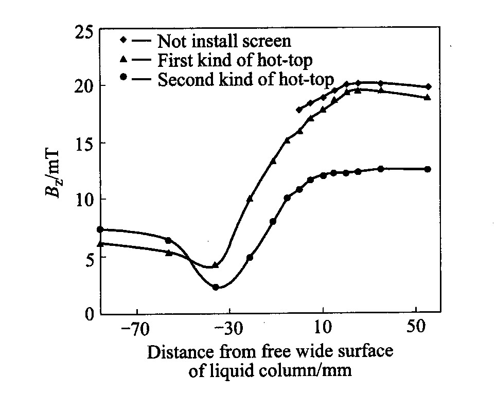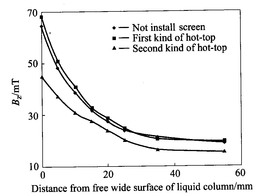 图5所示为距线圈中心线下12 mm处铸锭宽度中心线上的磁场分布。 可以看出, 未加屏蔽罩和采用热顶1两种情况下的磁场强度基本相同, 分布规律基本一致。 在热顶-电磁铸造的条件下, 由于不要求p m 和ρgh 处处平衡, 因此应尽可能发挥磁场的功效, 满足半悬浮液柱的成型条件, 保证液态金属在自由表面状态下凝固。