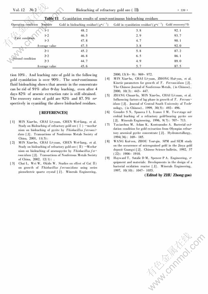 Key words:refractory arsenical gold concentrate; fluid-bed reactor; semi-continuous bioleaching