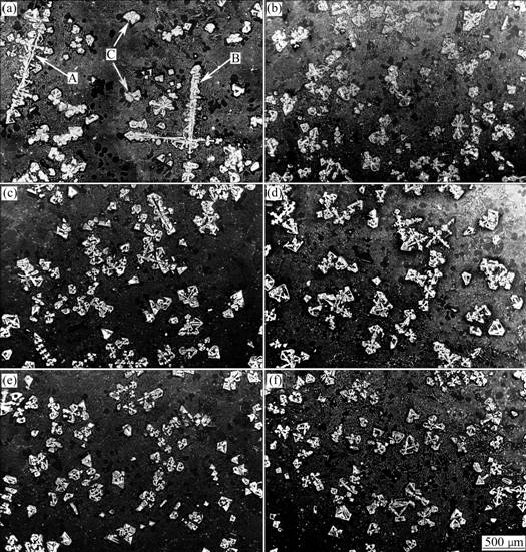 Fig.2 shows the SEM images of the hypereutectic Mg-Si alloy treated by different routes. For the sample without any treatment, the primary Mg2Si crystals present mainly complex dendritic morphologies, like the crystals denoted by A and B in Fig.2(a). In addition, the primary Mg2Si crystals with polygonal morphologies could also be observed, like the crystals denoted by C.