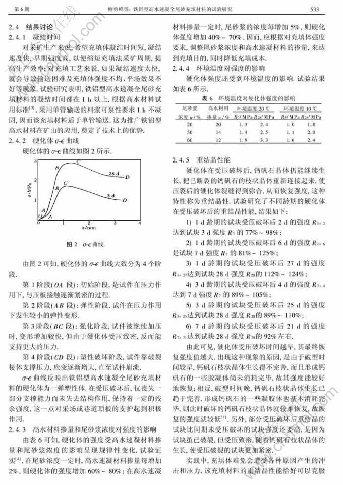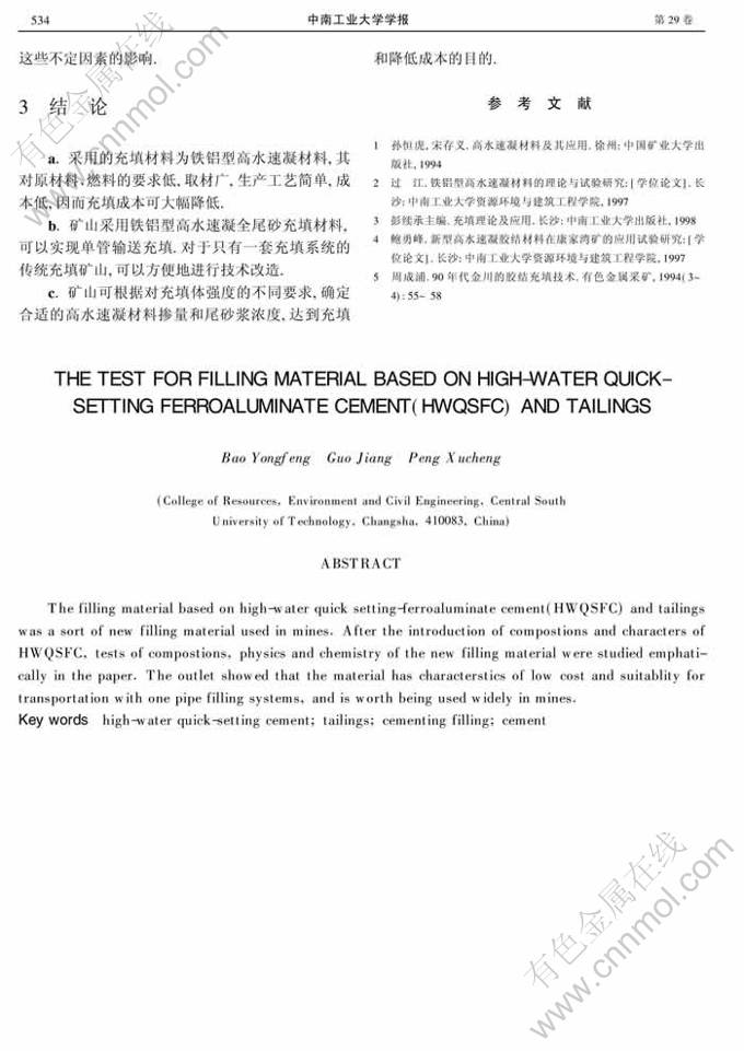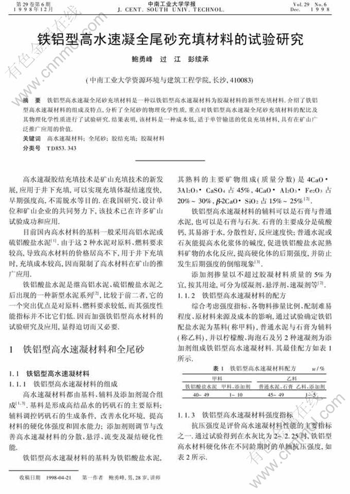 关键词:高水速凝材料; 全尾砂; 胶结充填; 胶凝材料