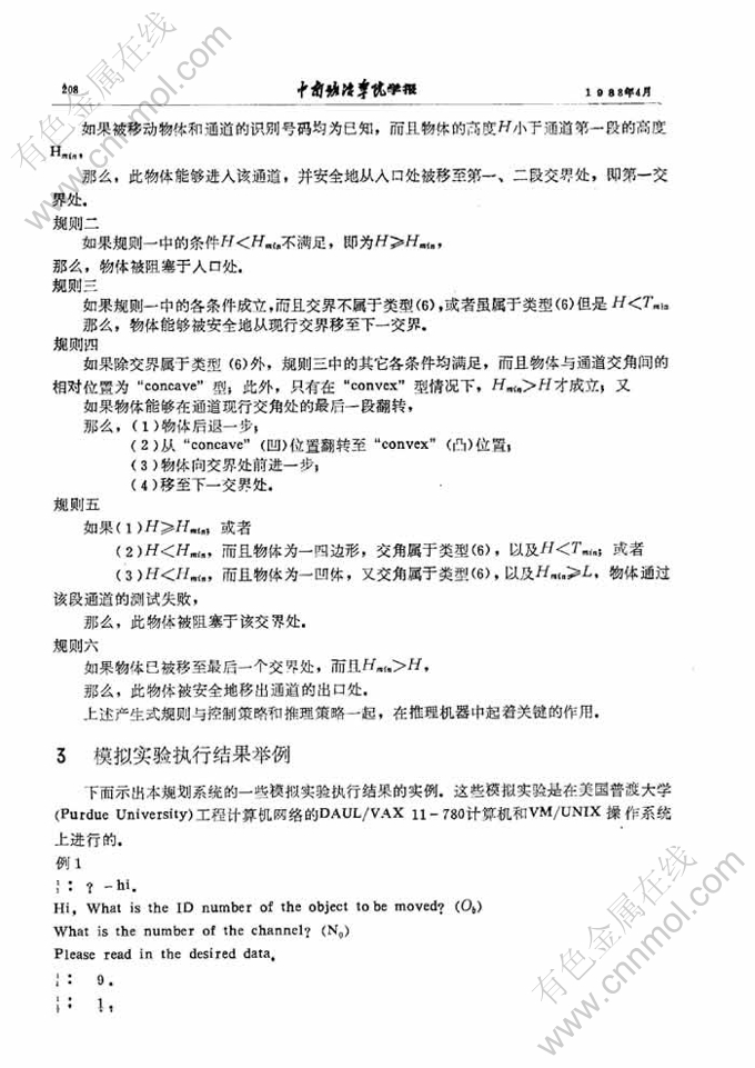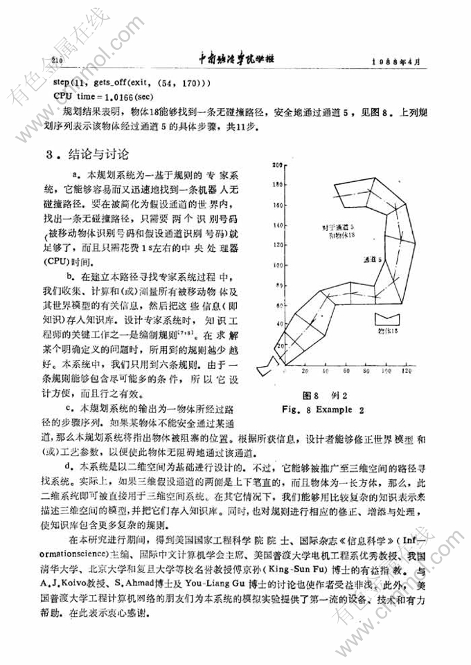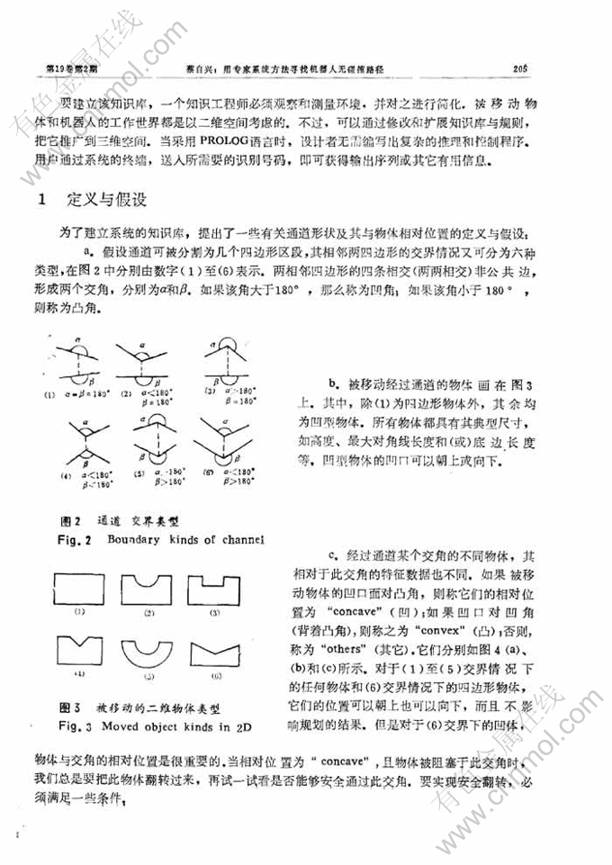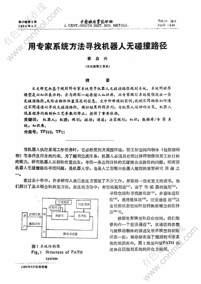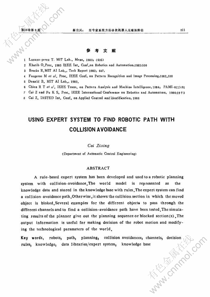 摘 要:本文研究把基于规则的专家系统用于机器人无碰撞路径规划系统。系统的世界模型是以知识表示的,并与规则一起存储入知识库。此专家规划系统能够找出一条无碰撞路径,或给出物体阻塞区段的信息。文中所举模拟实例,说明不同物体如何通过不同通道以寻找无碰撞路径。模拟结果所得序列,为机器人运动的决策、机器人低层程序的编制和工艺参数的修正,提供了重要依据。
