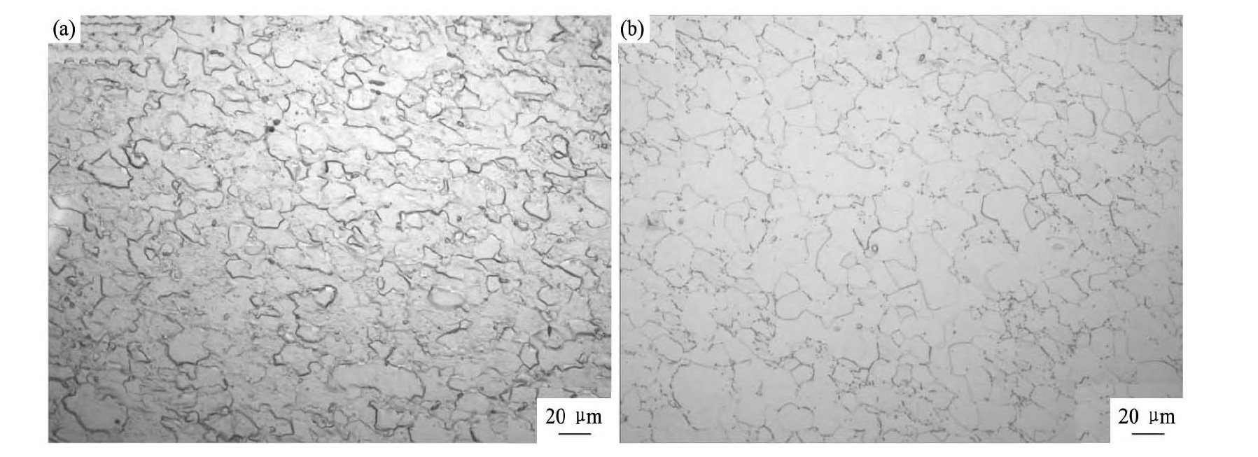 图1 合金热轧棒材及固溶处理后的金相显微组织Fig.1 OM images of structure of alloy after rolling and solution treatment