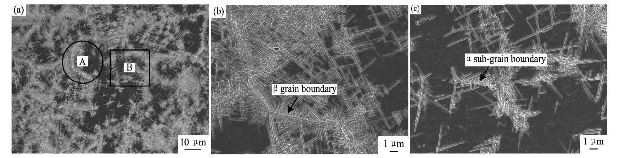 图3所示为该合金经720℃/30 min/AC固溶+460℃时效3 h后的SEM形貌。从图3(b)可以看出,β晶界上析出许多细小的针状α相,且与β基体有着固定的位向关系。从图3(c)可以看出,时效组织中存在大量晶内析出α相,因α相在晶体学上存在12个位向,所以有多种变体。α相在β晶粒内不均匀形核,点状α相“连点成线”,形成“雪片状”组织。