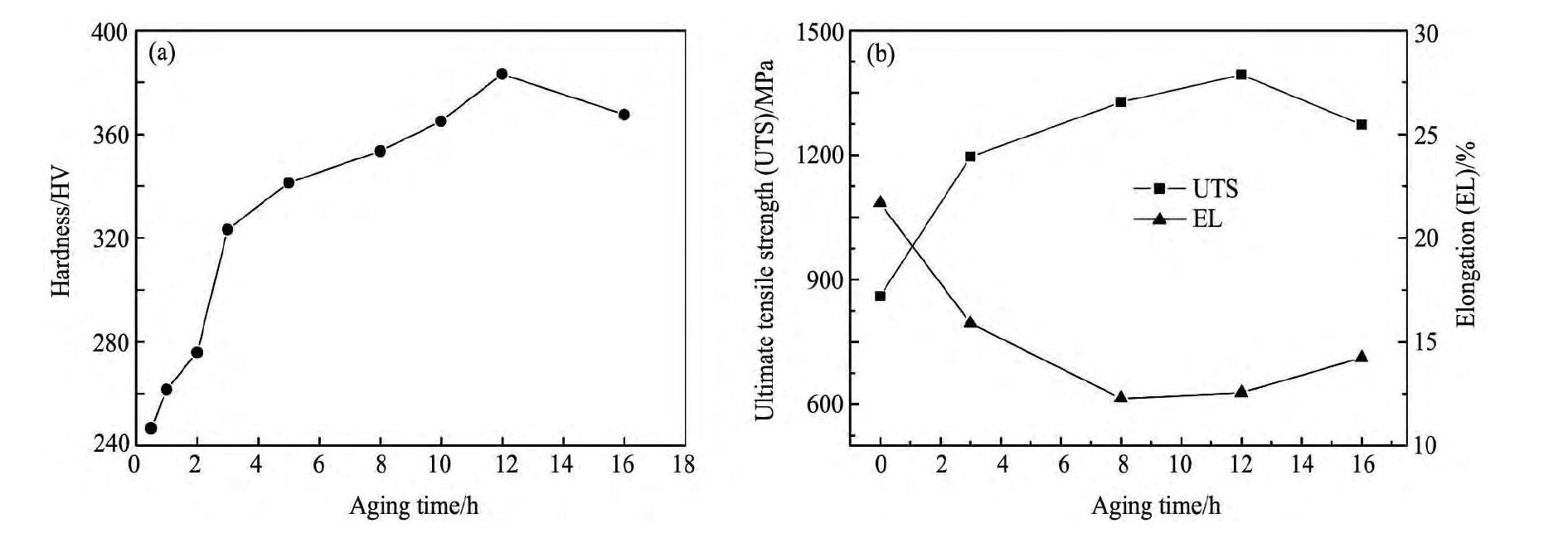 ;当时效时间超过12 h后,α相晶粒尺寸开始快速长大,出现过时效现象,将使合金硬度和强度下降。该合金的硬度和强度变化数据与其组织形貌相一致,α析出相体积分数增加引起的硬化和尺寸增加引起的软化相竞争,使得合金硬度和强度先增后降。本文研究范围内,该合金时效处理12 h后可获得优良的强度与塑性匹配:抗拉强度Rm =1393.6 MPa,延伸率A=12.56%。