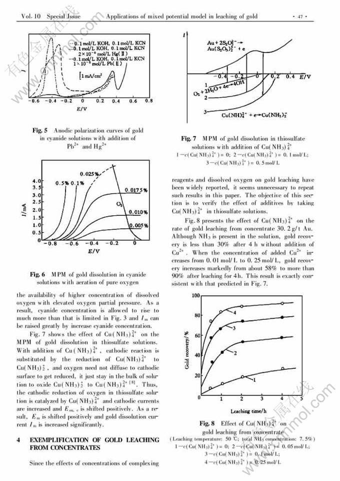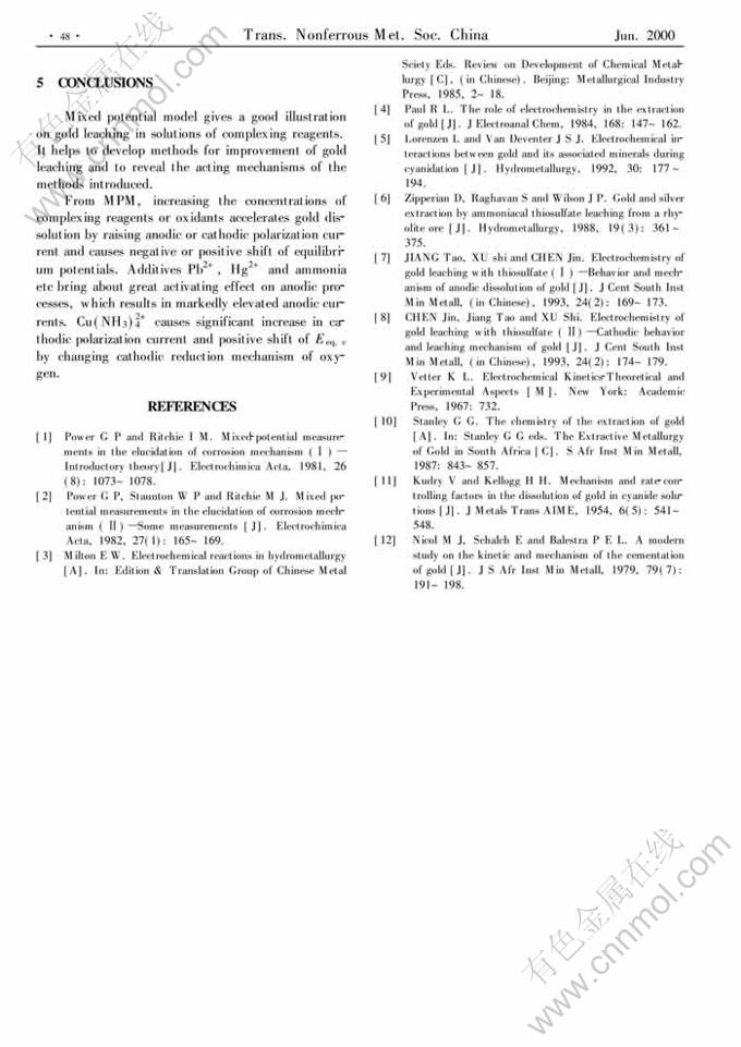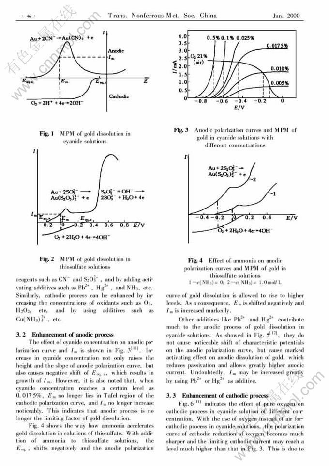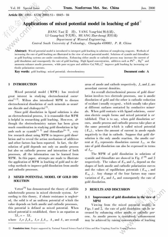Abstract: Mixed potential model is introduced to interpret gold leaching in solutions of complexing reagents. Methods of increasing the rate of gold leaching are illustrated in the view of mixed potential model. Solutions of cyanide and thiosulfate as gold leaching systems are under consideration. Enhancing either anodic or cathodic process may increase the current of gold dissolution and consequently the rate of gold leaching. High ligand concentration, additives such as Pb2+ , Hg2+ and ammonia enhance anodic processes, while pure oxygen and additive Cu(NH3)2+4 improve gold leaching by increasing cathodic polarization currents.