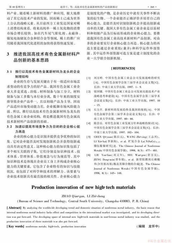 Abstract: By analyzing the worldwide developing trend and domestic situation of nonferrous metal industry, the basic reason that internal nonferrous metal industry lacks effect and competition in the international market was investigated, and its developing direction was put forward. The developing space of internal new high tech materials in non ferrous metal industry was studied, and the production innovation of these materials was also put forward.
