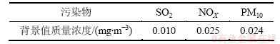 环境背景值取值原则为:有环境例行监测点的,可采用清洁对照监测点的年平均数据。若清洁对照点难以代表区域清洁水平或清洁对照监测点无年平均数据的,可参考国家空气质量标准中年平均一级标准的50%~70%选取,SO2和NO2取50%~60%,PM10取60%~70%[7]。本文SO2按空气质量标准中年平均一级标准的50%选取,NOX背景值浓度为NO2的年平均一级标准的50%乘上1.25的换算系数[6],PM10按60%选取。由于空气质量标准GB 3095—1996和GB 3095—2012中SO2,NO2和PM10的年均一级标准浓度值一致,因此基准年和规划年环境背景值质量浓度取值相同,如表2所示。