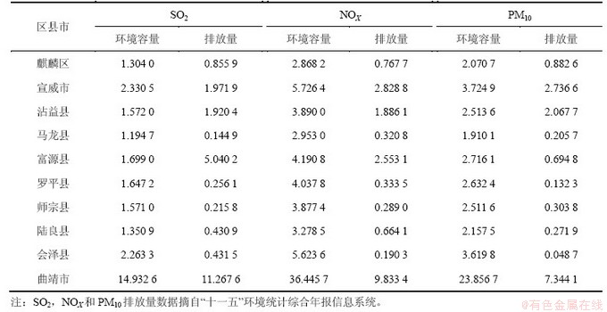 由表3可以看出:2009年曲靖市全控制区SO2,NOX和PM10的环境容量分别为14.932 6,36.445 7和23.856 7万t,排放量均未超过其环境容量,9个控制区除个别县外均有富余的环境容量,其中,沾益县和富源县SO2排放量分别超出环境容量0.348 4和3.341 2万t,这是由于沾益县和富源县火电厂SO2高排放量导致。