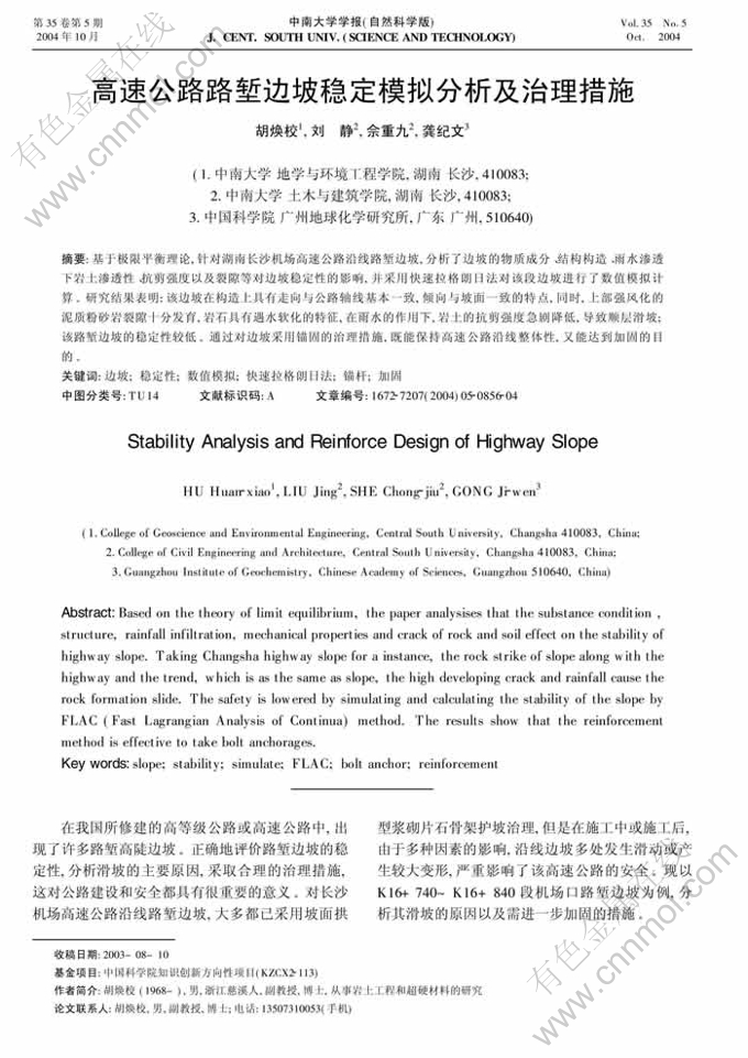关键词:边坡;稳定性;数值模拟;快速拉格朗日法;锚杆;加固