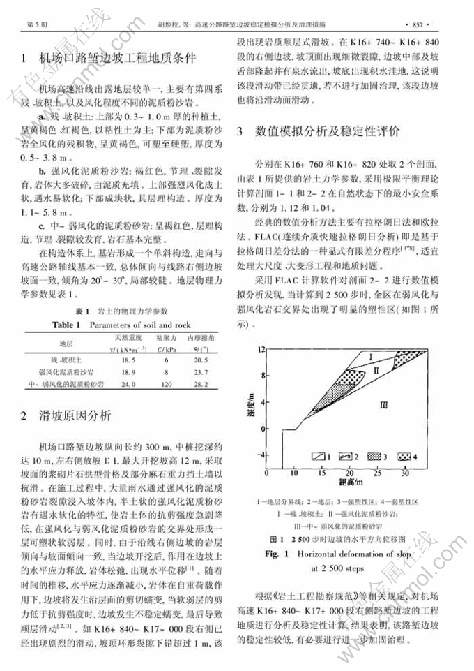 摘 要:基于极限平衡理论,针对湖南长沙机场高速公路沿线路堑边坡,分析了边坡的物质成分、结构构造、雨水渗透下岩土渗透性、抗剪强度以及裂隙等对边坡稳定性的影响,并采用快速拉格朗日法对该段边坡进行了数值模拟计算。研究结果表明:该边坡在构造上具有走向与公路轴线基本一致,倾向与坡面一致的特点,同时,上部强风化的泥质粉砂岩裂隙十分发育,岩石具有遇水软化的特征,在雨水的作用下,岩土的抗剪强度急剧降低,导致顺层滑坡;该路堑边坡的稳定性较低。通过对边坡采用锚固的治理措施,既能保持高速公路沿线整体性,又能达到加固的目的。