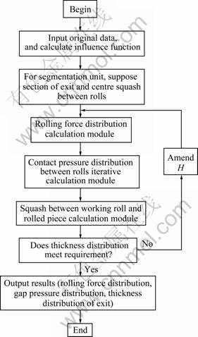 In order to analyze the parameters in the model of the crown of loaded gap, and research the control performance of the shape adjustment means [17-19] from reversing cold rolling mill, the deformation model of roll system is built by the influence function method [20-21], which is used to analyze the relevant parameters in each pass. The calculation process is shown in Fig.1. Specific model parameters are as follows. Dimensions of work roll barrel are 420 mm × 1 250 mm, dimensions of intermediate roll barrel are 470 mm × 1 250 mm, dimensions of back-up roll barrel are 1 260 mm × 1 250 mm, load center distance of bending force is 2 230 mm, and restrict center distance of back-up roll is 2 410 mm.