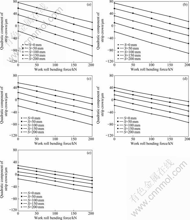 Fig.2 Quadratic components of strip crown at different work roll bending forces and intermediate roll shifting positions of 6-high rolling mill: (a) First pass; (b) Second pass; (c) Third pass; (d) Fourth pass; (e) Fifth pass