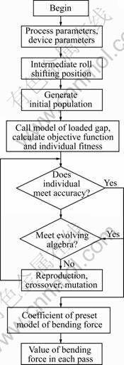 The preset model of bending force is mainly based on the strip initial data, including steel grade, width, entry thickness and thickness of end product. Then, by calculating the crown of loaded gap, and using the genetic algorithm, the bending force model is found, which can minimum the objective function in each pass. The calculation process is shown in Fig.3.