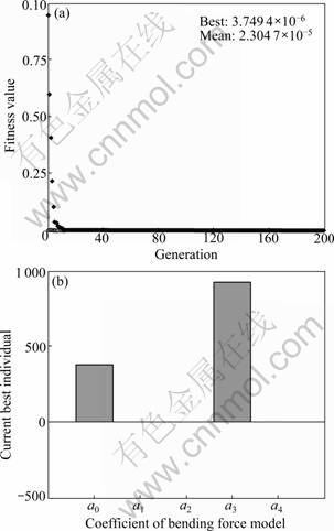 According to the on-site intermediate roll shift model, the shifting value of intermediate roll was 100 mm in each pass under this specification ((2.2- 0.32 mm) × 950 mm), and then the optimal solution of the various parameters were received in the preset model of bending force as Eq.(7). The change of the average value in population objective function and the best individual variables after 200 genetic iterations are shown in Fig.4.