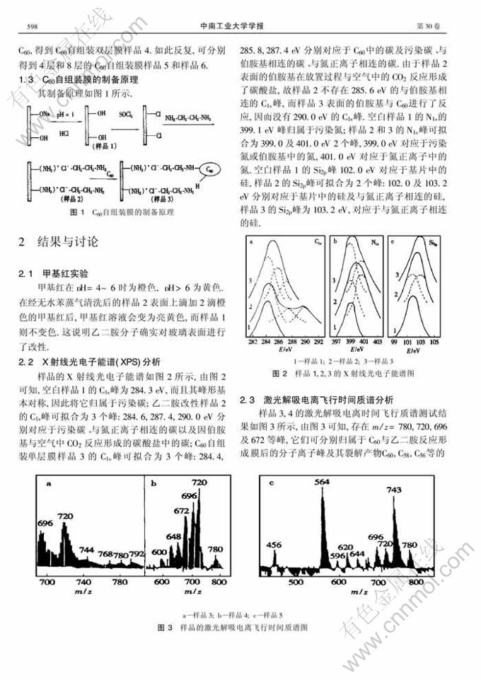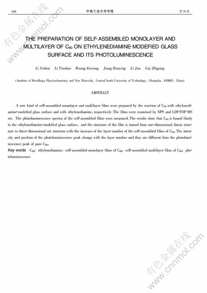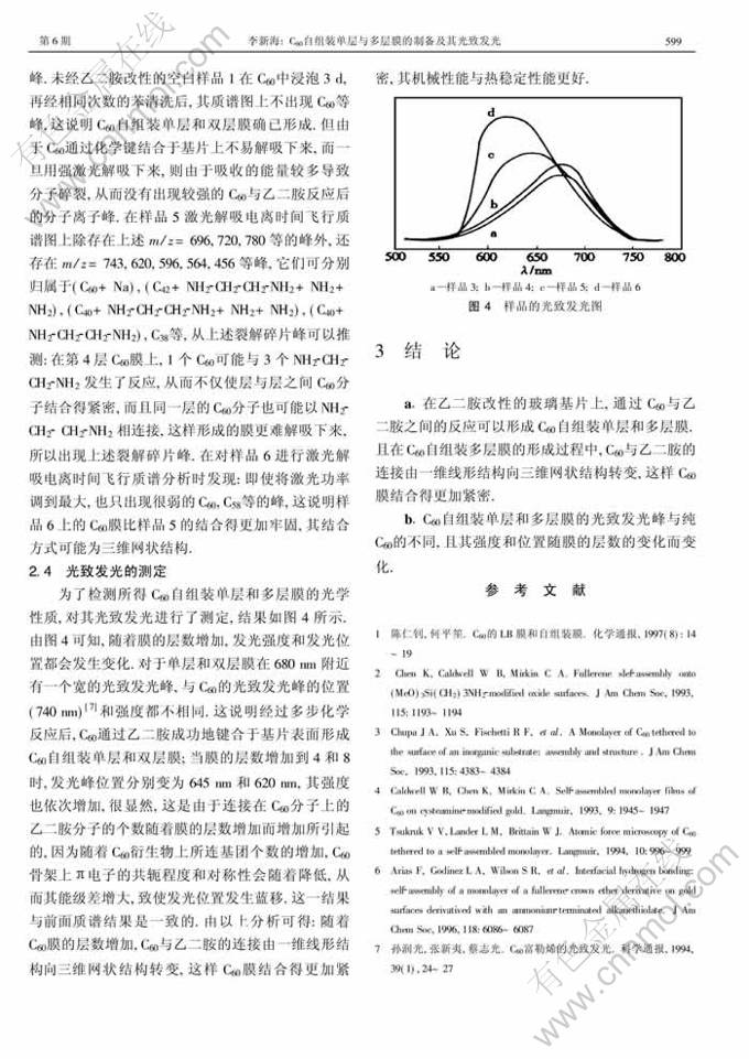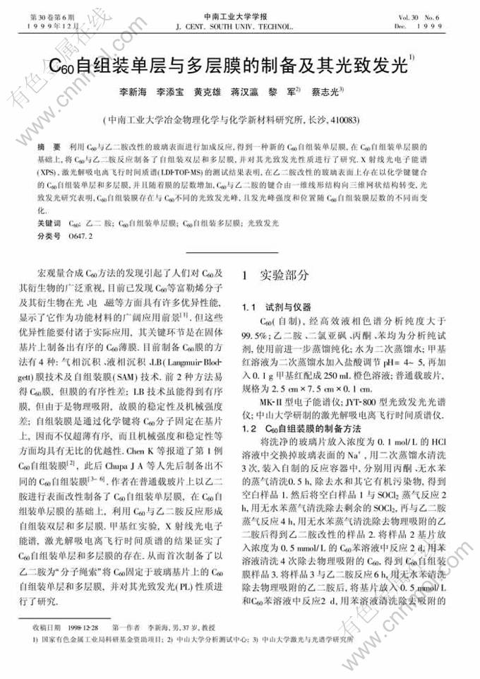 关键词:C60;乙二胺;C60自组装单层膜; C60自组装多层膜;光致发光