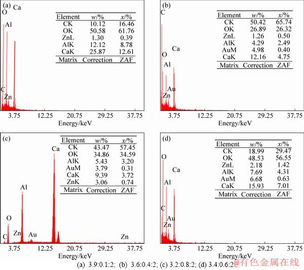 Figure 4 EDX analysis of CaZnAl-CO3-LDHs with different Ca/Zn/Al molar ratios: