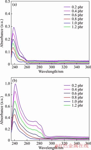 Figure 11 UV-VIS spectrum of PVC samples with Ca3.6Zn0.4Al2-CO3-LDHs (6 phr) incorporated with different amounts of CaSt2 heated at 180 °C for (a) 0 min and (b) 60 min