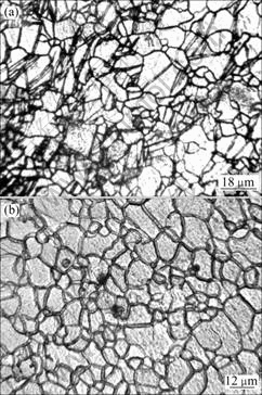 图5所示为不同轧制温度下异步轧制制备的AZ31镁合金板材的显微组织。可见,当轧制温度为350 ℃时, 板材组织为部分细小的等轴晶和部分较大的晶粒共存,晶粒粒度为5~20 ?m,且有大量孪晶存在;而当轧制温度升高到400 ℃时,大部分晶粒为等轴晶,粒度为10 ?m左右,少量为粒度较大的粗晶,孪晶明显减少。