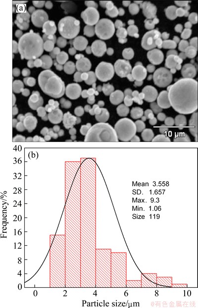 Fig. 2 Morphology of fine zinc powder (a) and its particle size distribution (b)