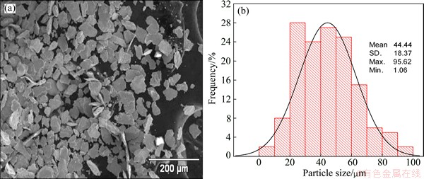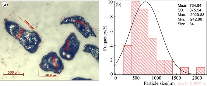 Fig. 4 Morphology of coarse zinc powder (a) and its particle size distribution (b)