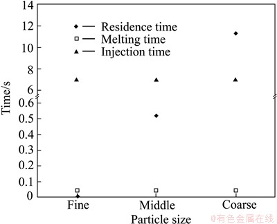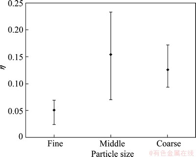 Table 1 shows the results of the injection trials for the three sizes of zinc particle. The amount of Pb-Ag alloy with its corresponding stoichiometric zinc amount, the initial (w(Ag)initial) and final (w(Ag)final) content of silver in the alloy and the ratio (w(Ag)final/w(Ag)initial) are presented in Table 1. The amount of zinc added considers reaction (1) and the silver content of 0.0132% in the Pb-Ag alloy. The silver removal (η) is presented as desilvering fraction, which is calculated according to the following expression: η=1-w(Ag)final/w(Ag)initial. An average desilvering efficiency of 6%, 18% and 13% was obtained for the fine, middle and coarse zinc particles, respectively. Figure 5 shows the desilvering fraction for the three zinc particles. The best desilvering fraction was obtained for middle particle size and the worst result was attained for the fine particle size. As can be observed in Fig. 5, there is a high dispersion on the experimental results, which is directly related with the particle size distribution for the three sizes. The middle size presents the best desilvering value; however, this silver removal efficiency could be increased up to a value of 28% or decreased to a value of 7%. For this particle size, it must be required to decrease the wide particle size distribution in order to increase the silver removal. The fine particle size achieves the lower silver removal, contrary to the expected due to its higher surface area which increases the reaction kinetic. In order to explain the experimental results, the residence and melting time are obtained. The residence time represents the time spent for the particles to reach the liquid surface after they leave the lance tip supported with the conveying gas. The residence time is calculated based on the efficiency of the transitory reaction given by OHGUCHI and ROBERTSON [19] with Eq. (2).
