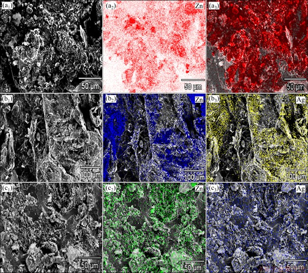 Fig. 8 X-ray mappings of Zn and Ag elements obtained for slag with injection of fine (a1, a2, a3), middle (b1, b2, b3) and coarse (c1, c2, c3) zinc particles