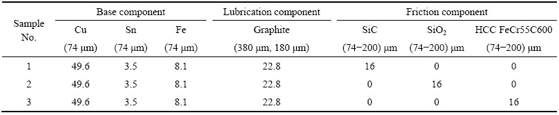 铜基粉末冶金摩擦材料是一种由金属基体、摩擦组元和润滑组元组成,采用粉末冶金方法制备的多组分复合材料,因其具有良好的高温摩擦性能、导热性能和耐磨性能等,广泛应用于航天航空、高速列车、船舶和工程机械等重载及恶劣工况下的制动器和离合器中[1-4]。在铜基粉末冶金摩擦材料中,基体组元用于提供材料必要的力学性能和物理化学性能;润滑组元则用于改善抗卡滞性能,以保证制动平稳性,并提高材料的耐磨性能;而摩擦组元的作用为补偿固体润滑剂的影响及在不损害摩擦表面的前提下增加滑动阻力,提高摩擦因数,摩擦组元的设计关系到铜基粉末冶金材料摩擦性能的优劣,为粉末冶金摩擦材料设计与制备的技术关键。