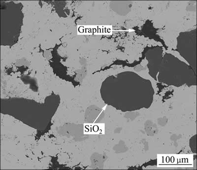 图2所示为添加了SiO2材料的界面SEM像。由图2可见,SiO2与基体结合良好,结合界面处无明显孔隙等缺陷。SiO2化学性质稳定,不与任何添加组元反应,且其与基体Cu润湿性较好,形成紧密的机械结合。最终,SiO2与基体形成紧密机械结合界面。