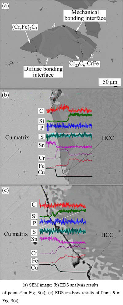 SiC分别与基体Cu及基体Fe形成机械结合与反应结合界面,因此,可以认为其与基体形成机械-反应混合结合界面。