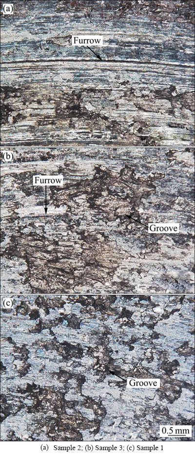 与亚表面对应的材料表面形貌如图7所示。含SiO2的样品2由于表面未形成机械混合层,导致材料表面发生剧烈犁削磨损,如图7(a)所示,样品2的表面磨损形貌以犁沟为主。而含高碳铬铁与SiC材料在摩擦过程中均发生剥层,在摩擦表面形成剥层凹坑,并导致机械混合层产生,降低了摩擦材料表面受到的犁削,但由于高碳铬铁形成的机械混合层较薄,不能完全保护材料基体,故含高碳铬铁的样品3的表面存在大量剥层凹坑及少量犁沟。含SiC的样品1的表面形成较厚机械混合层,极大地降低了材料表面所受的犁削,因此,样品磨损表面形貌主要以剥层凹坑为主,如图7(c)所示。可以认为,随着机械混合层厚度的增加,犁削磨损减弱,剥层磨损加强。