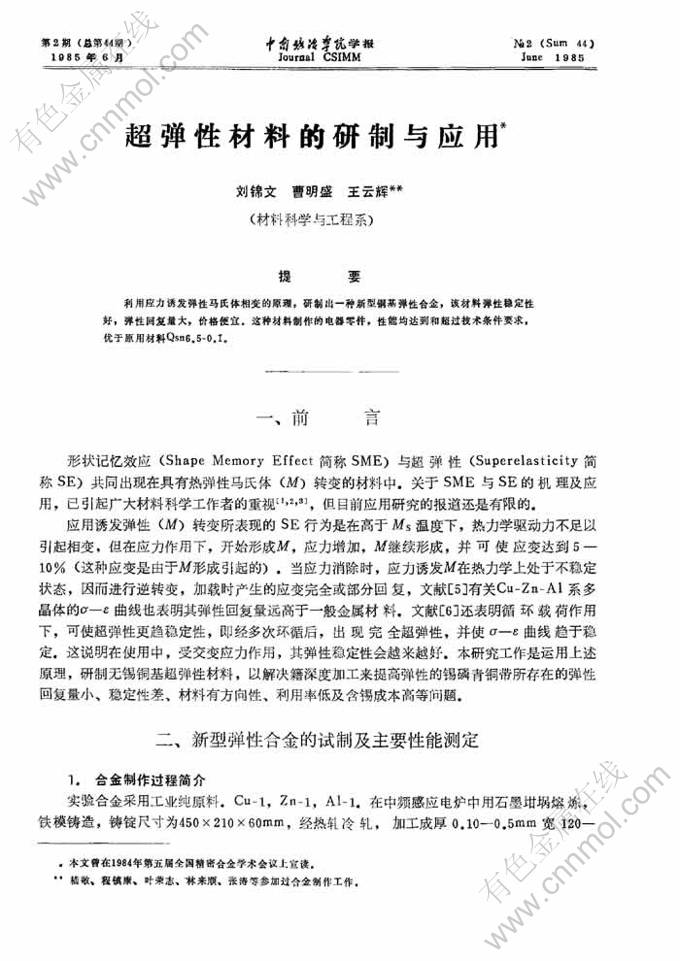关键词:研制与应用; 超弹性材料; 弹性稳定性; 弹性回复; 马氏体相变; 应力诱发; 铜基弹性合金; 技术条件; 锡磷青铜; 装机试验
