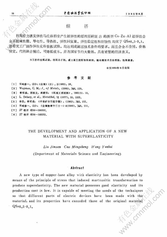 Abstract: A new type of copper-base alloy with elasticity has been developed by means of the principle of stress that induced martensitic transformation to produce superelasticity. The new material possesses good elasticity and its production cost is low. It is capable of meeting the needs of the techniques so that different parts of electric devices have been made with the material, and its properties have exceeded those of the original material QSn6.5-0.1.