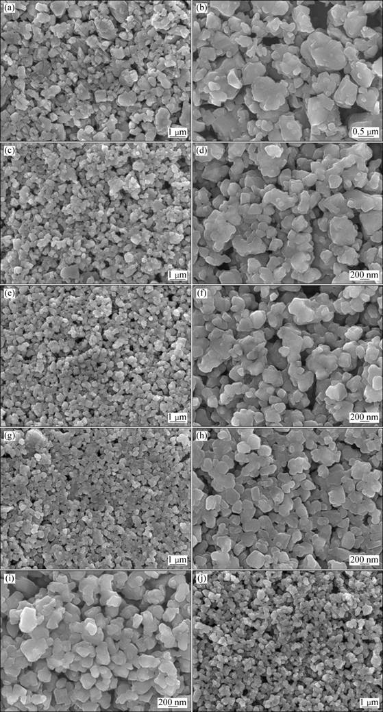 In order to investigate the effect of the quantity of lauric acid on the particle size and the morphology, the field emission scanning electron micrographs of the synthesized LTO, LTO-1, LTO-2, LTO-3 and LTO-4 powders with low and high magnification are shown in Fig. 2. Generally, the crystallite size of Li4Ti5O12 is about 150 nm in all these samples. These fine Li4Ti5O12 powders can be attributed to the sol-gel route in which an atomic level mixing of elements is achieved. From Figs. 2(a) and (b) it can be seen that the pure LTO sample appears as heavily aggregated micron-sized particles of 1-2 μm in diameter. We assume that these densely agglomerated particles can make the Li+ insertion/extraction in individual Li4Ti5O12 grains inhomogeneous. The Li4Ti5O12 grains inside the densely packed particles might be inactive especially during cycle at high current densities due to the increased Li+ diffusion distance. These results manifest that the aggregation is a significant problem related to the conventional sol-gel method although fine crystals can also be prepared.
