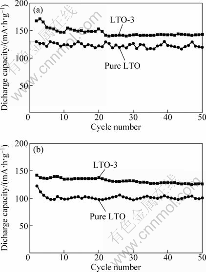 Fig. 8 Cycle performance of Li4Ti5O12 electrodes prepared from LTO-3 and pure LTO samples at 0.5C (a) and 1C (b) rates