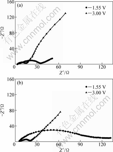 Fig. 9 Electrochemical impedance spectra of Li4Ti5O12 electrodes at 0% DOD (3.0 V vs Li+/Li) and 40% DOD (1.55 V vs Li+/Li) prepared from LTO-3 (a) and pure LTO (b) samples