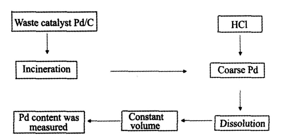 。 与其他工艺路线相比, 贵金属催化氧化法具有工艺流程短、 反应条件温和、 转化率高、 不含其他杂质等优点, 而钯的回收及再利用是降低成本的关键。 经过多次重复使用的活性炭载钯催化剂活性降低, 成为废催化剂, 必须进行钯的回收以降低成本且减少对环境的影响。 对于载体为炭质的催化剂, 目前通常采用焚烧法进行钯的回收, 将物料燃烧后, 用王水溶解烧灰将贵金属转入溶液然后再从溶液中提取钯