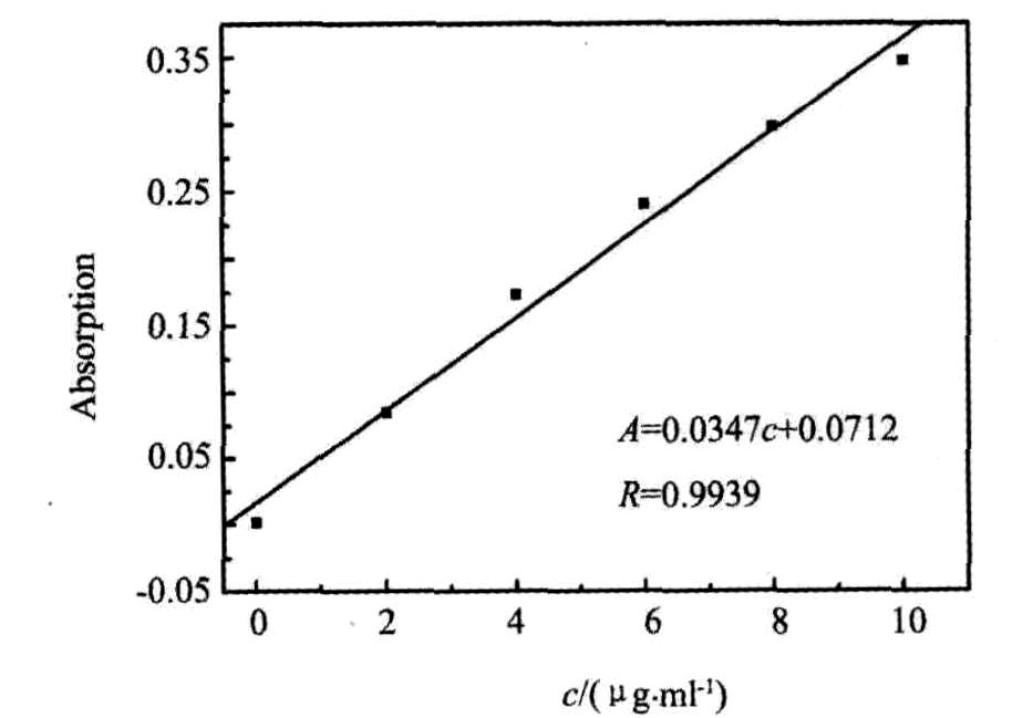 从图2可以看出, 当Pd质量浓度在0~10 μg·ml-1 时, 吸光度和Pd质量浓度之间有很好的线性关系, 相关系数为0.9939, 可以作为定量分析的标准曲线。 每次测量时的标准曲线相关系数均在0.99以上, 说明测量的准确度良好。