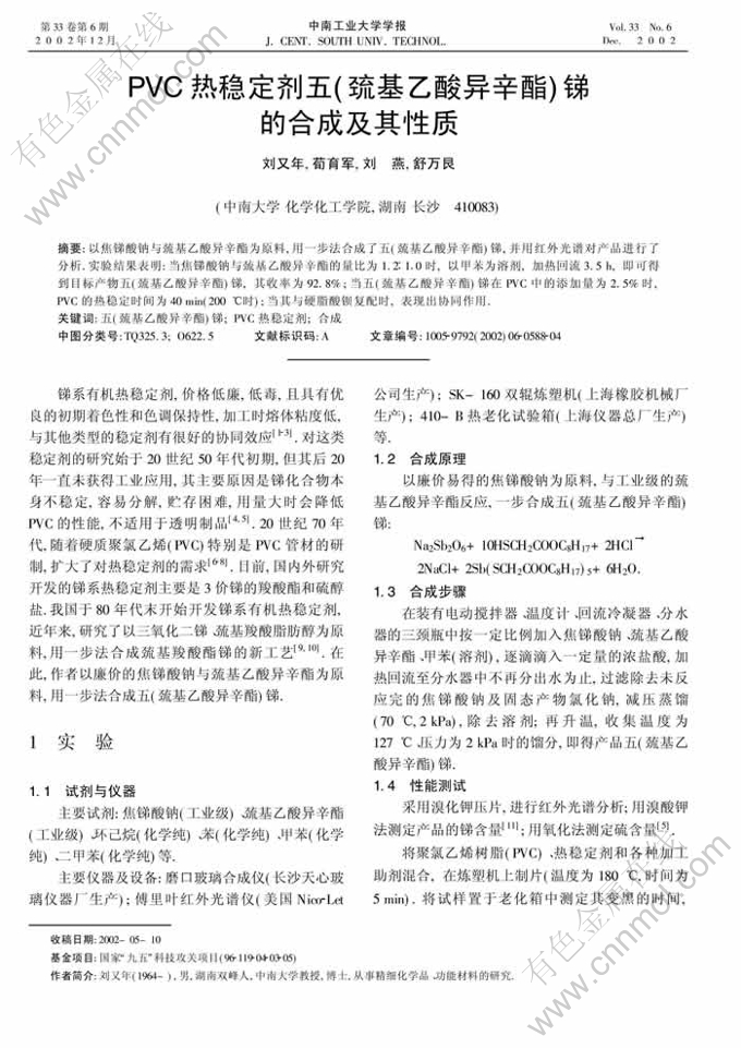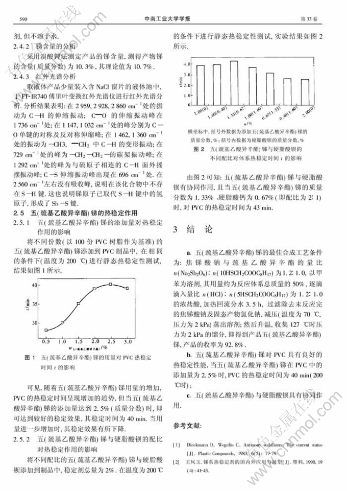 PVC热稳定剂五(巯基乙酸异辛酯)锑的合成及其性质