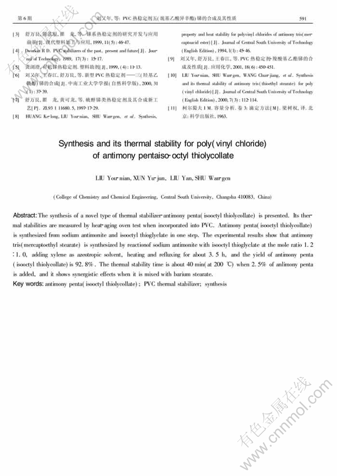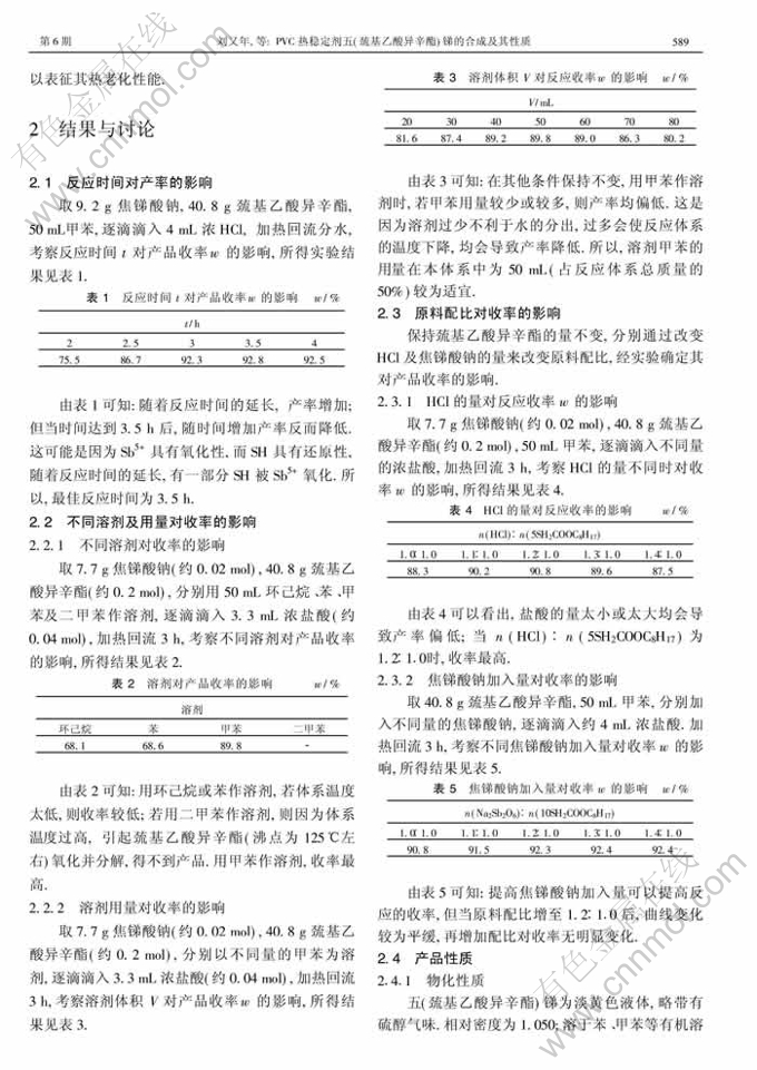 Key words:antimony penta(isooctyl thiolycollate); PVC thermal stabilizer; synthesis