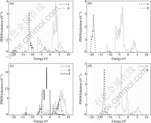 Fig. 4 PDOS of Bi (a), O (b), Cu (c) and S(d) of BiOCuS calculated by GGA