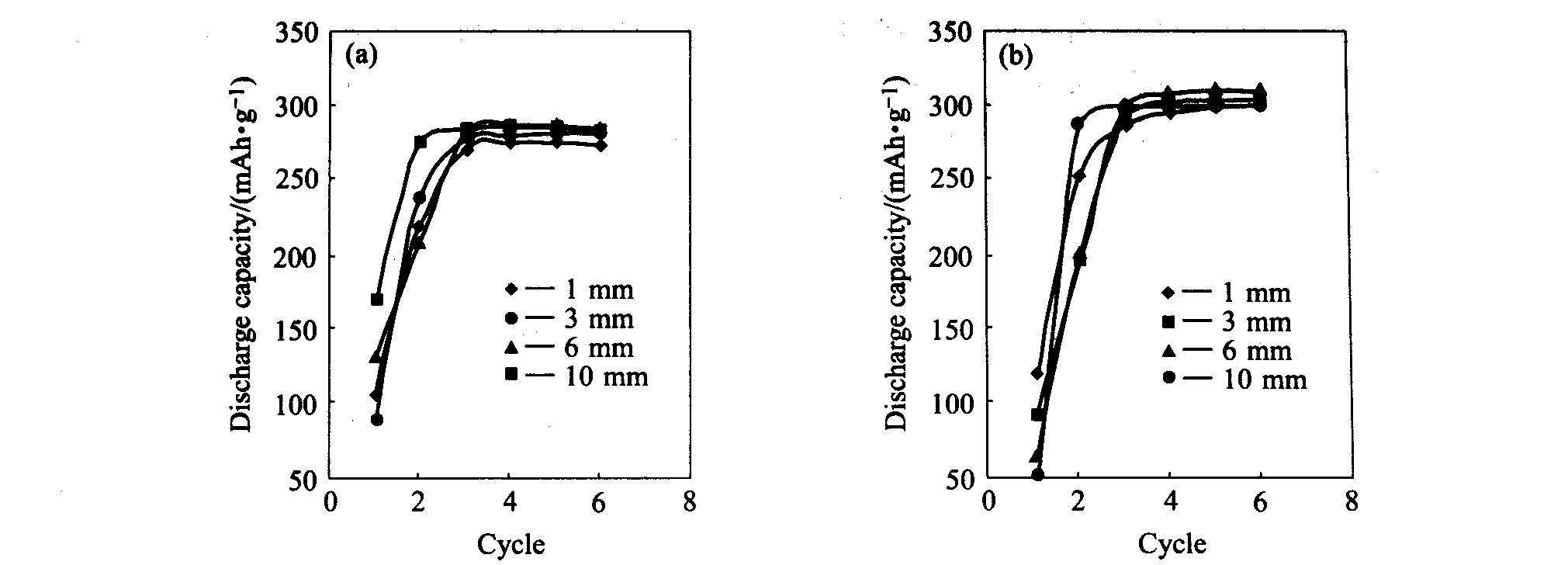 Fig.1 Effect of thickness of as-cast alloy ingots on 0.2 C discharge capacity (a)—LPC(NiCoMnAlCuFeSi)5 ; (b)—Mm(NiCoMnAl)5