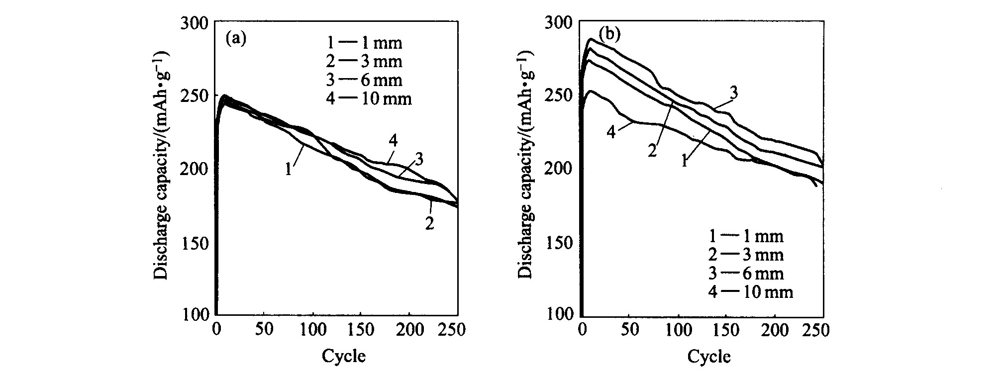 图2 铸态LPC(NiCoMnAlCuFeSi)5(a)和 Mm(NiCoMnAl)5(b)合金在不同厚度下的1 C循环稳定性曲线
