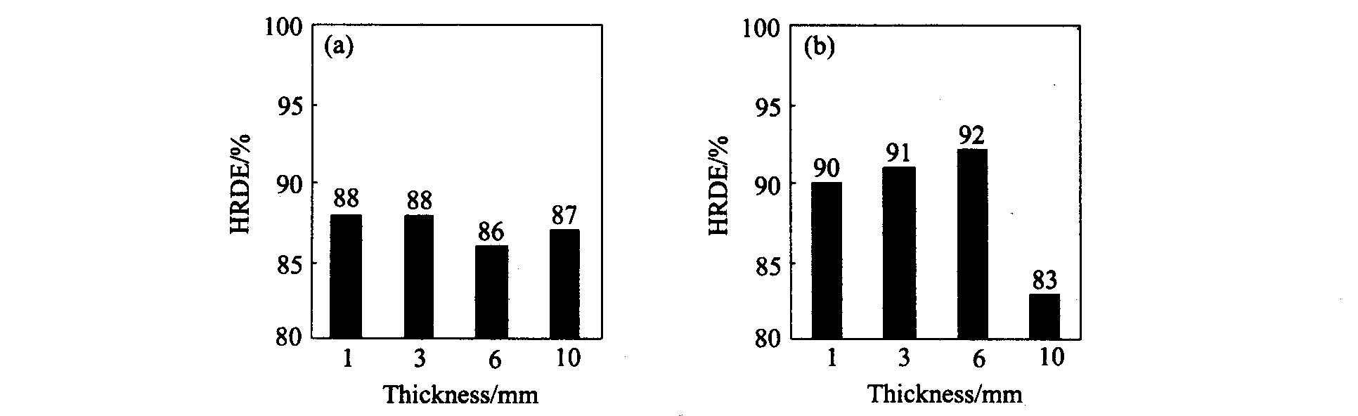 Fig.3 High-rate discharge efficiencies of both alloys with different thickness (a)—LPC(NiCoMnAlCuFeSi)5 ; (b)—Mm(NiCoMnAl)5
