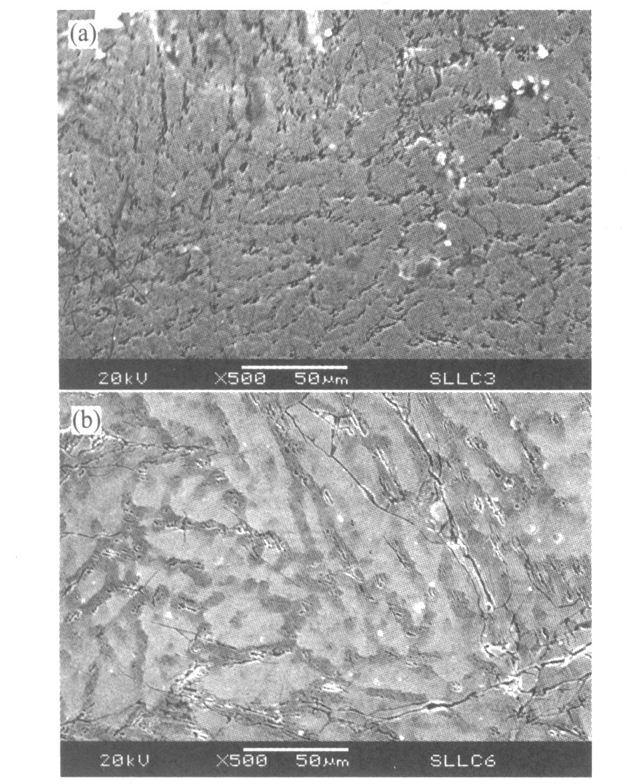 Fig.5 SEM images of LPC(NiCoMnAlCuFeSi)5 alloy with thickness of 3 mm (a) and 6 mm(b)