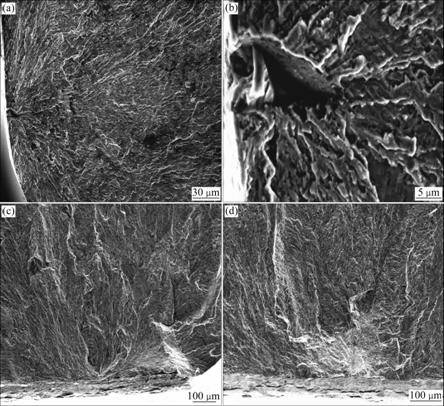 Fig.4 Typical fatigue crack initiation appearance: (a) Smax=510 MPa; (b) Local magnify of Fig.4(a); (c) Smax=420 MPa; (d) Smax= 410 MPa